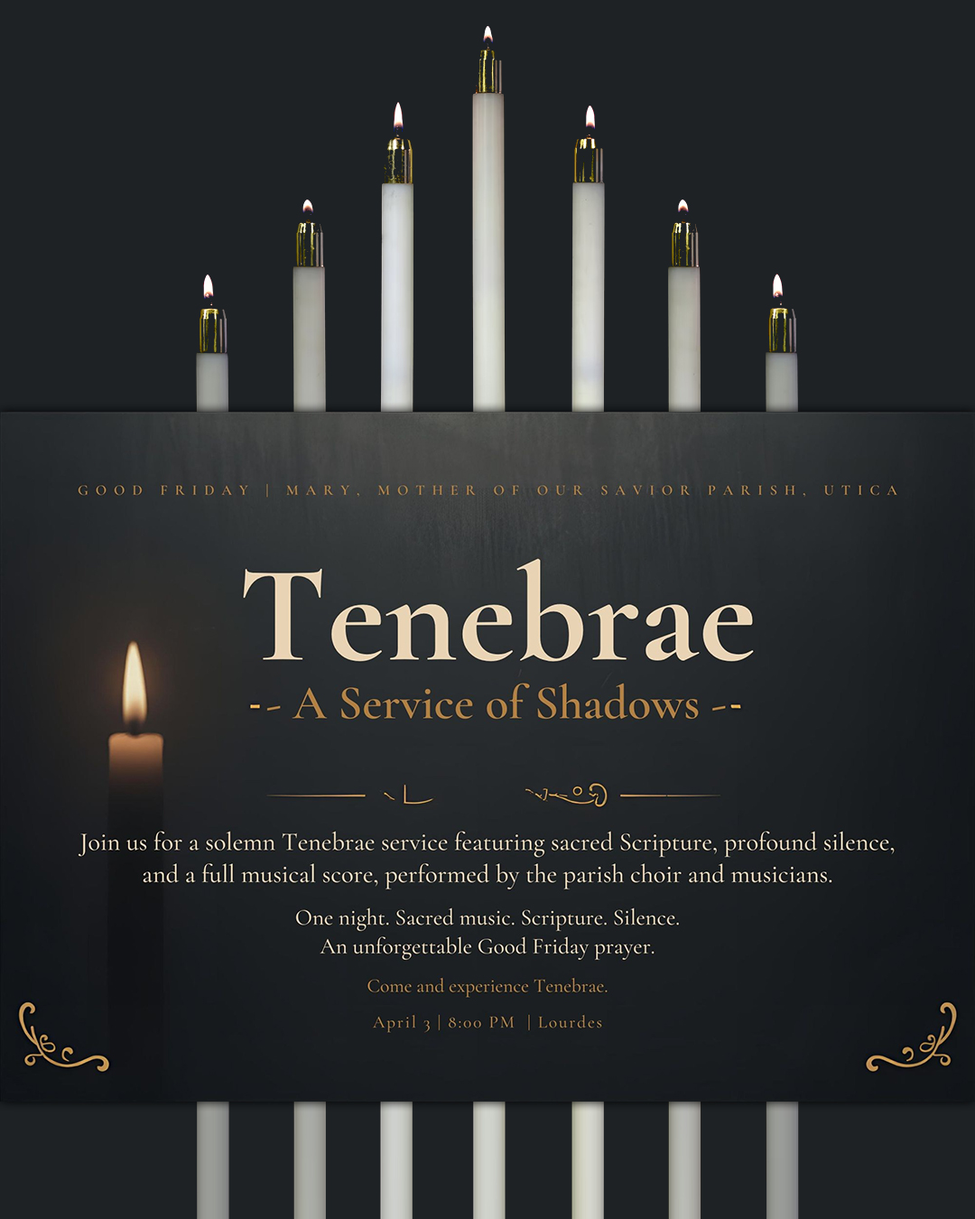 - 8:00pm – Tenebrae Service at the Lourdes Campus