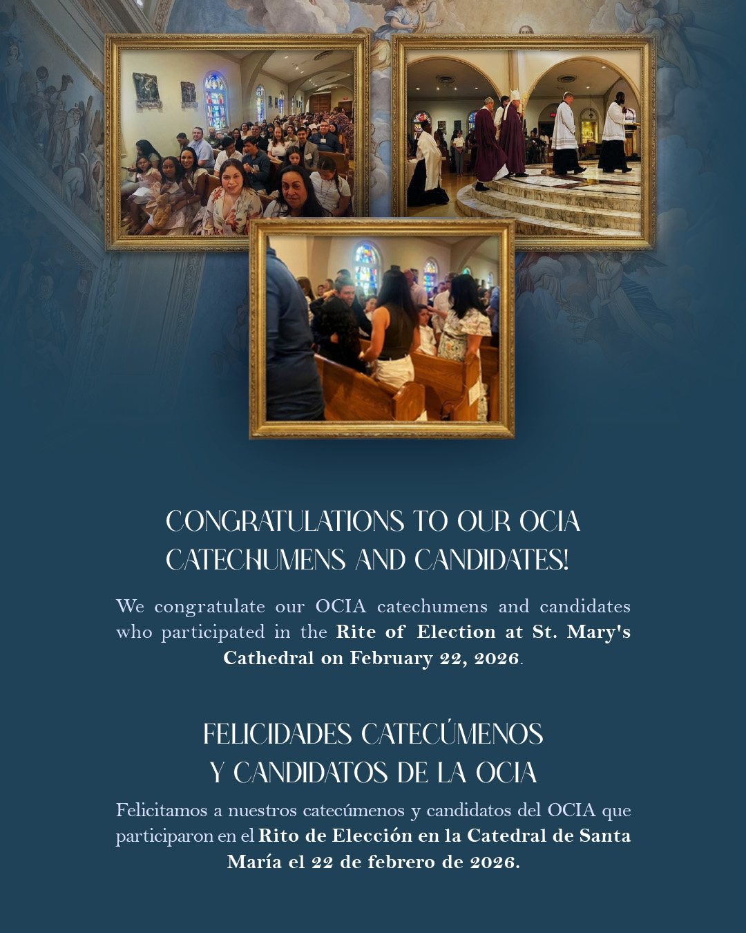We congratulate our OCIA catechumens and candidates who participated in the Rite of Election at St. Mary's Cathedral on February 22, 2026. Thank you to their sponsors and catechists and to all those who are supporting them in their journey of faith. - - - Felicitamos a nuestros catecúmenos y candidatos del OCIA que participaron en el Rito de Elección en la Catedral de Santa María el 22 de febrero de 2026. Gracias a sus padrinos y catequistas y a todos los que los apoyan en su camino de fe.