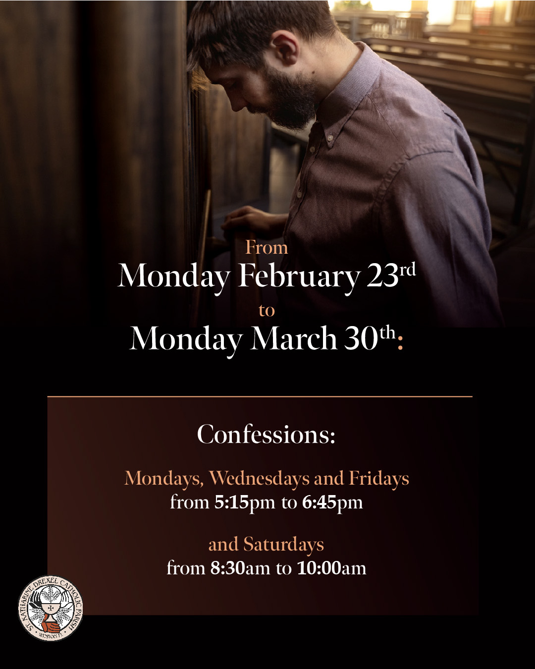 From Monday, February 23rd to Monday, March 30thConfessions:Mondays, Wednesdays and Fridaysfrom 5:15pm to 6:45pm and Saturdays from 8:30am to 10:00am