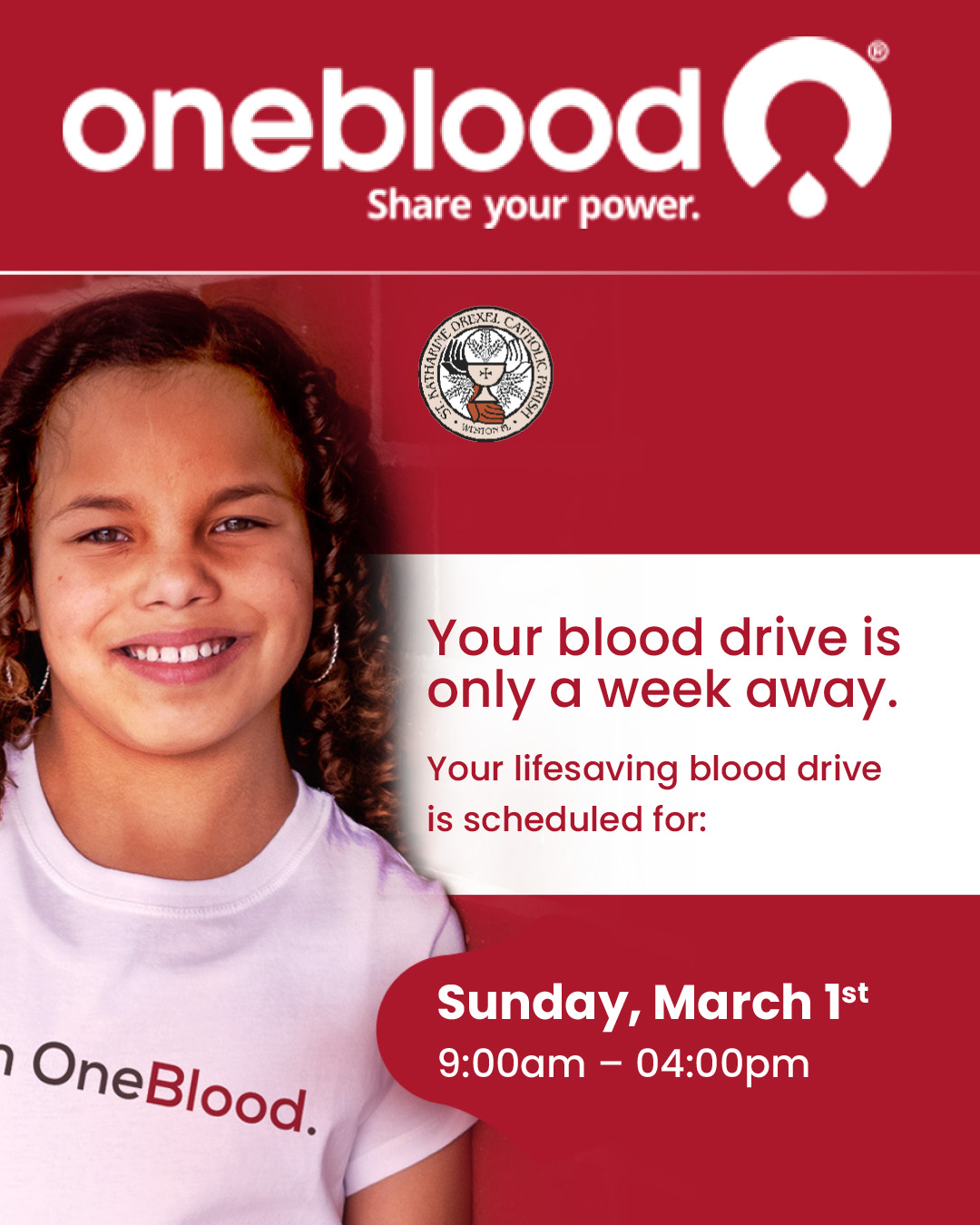 Sunday, March 1st - 9:00am to 4:00pm St. Katharine Drexel Catholic Parish Your blood drive is only a week away.