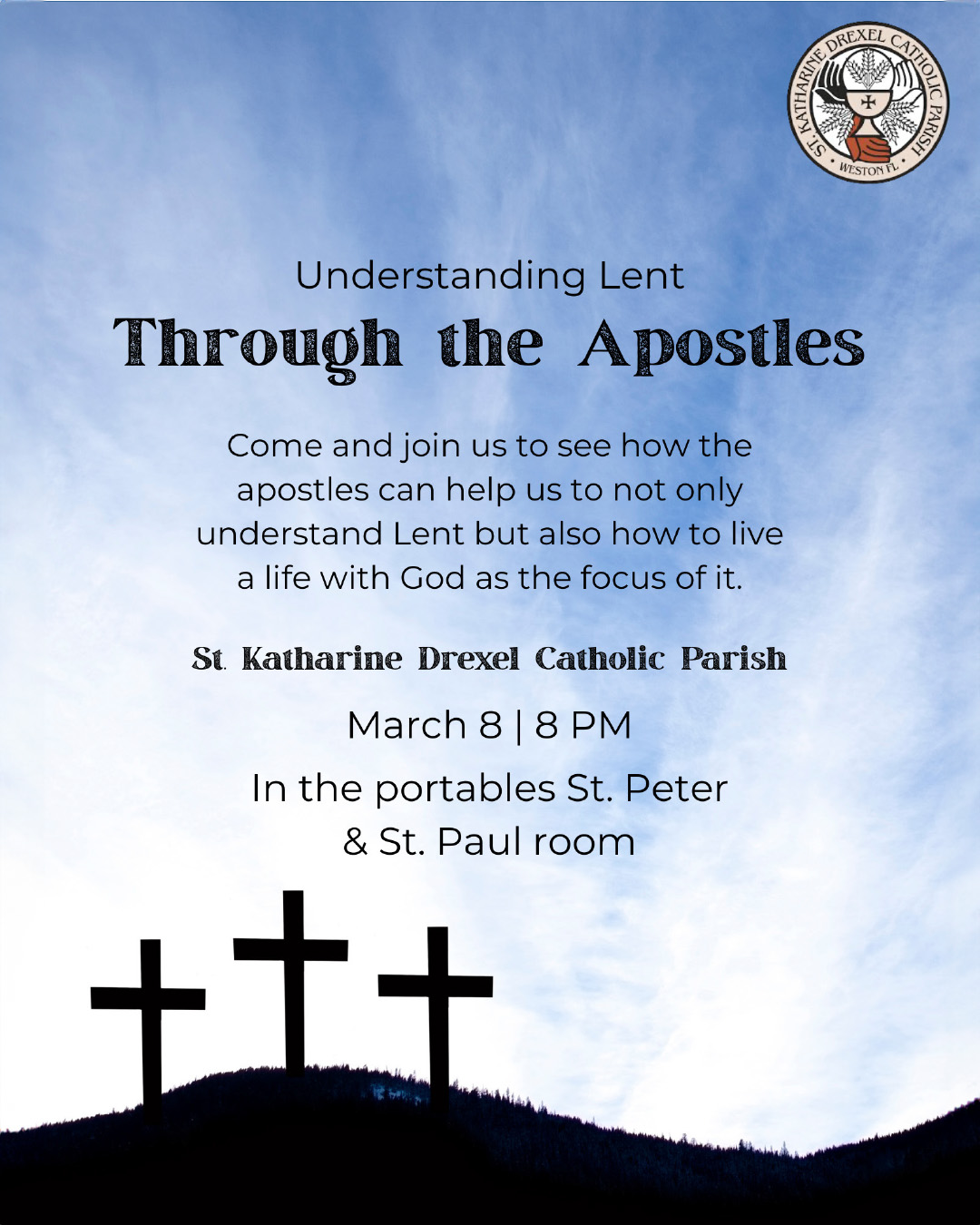 March 8th - 8:00pm St. Katharine Drexel Catholic ParishCome and join us to see how the apostles can help us to not only understand Lent but also how to live a life with God as the focus of it. In the portables St. Peter & St. Paul room