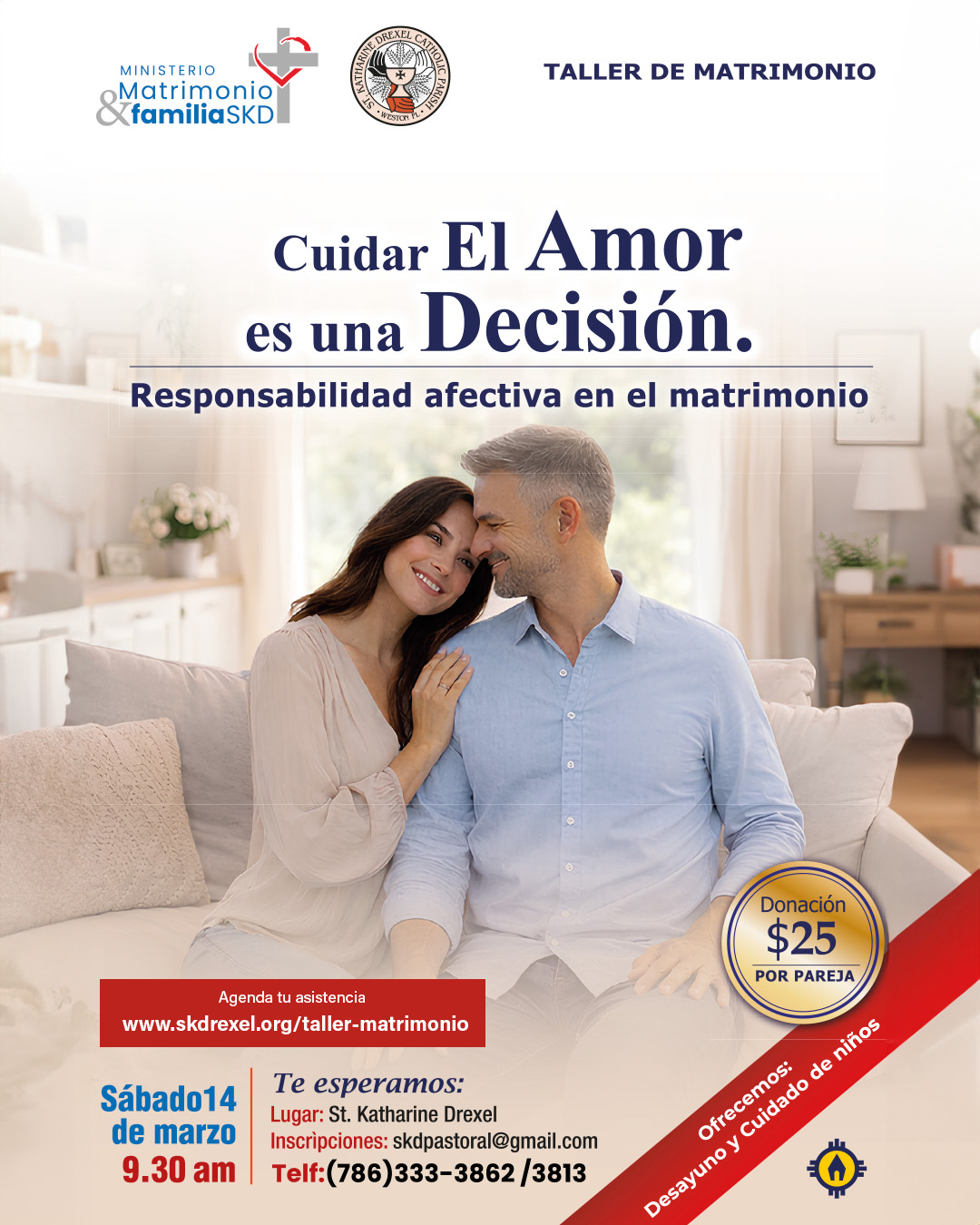 Sábado, 14 de marzo - 9:30am Parroquia Católica Santa Katharine Drexel Responsabilidad afectiva en el matrimonio Donación $25 POR PAREJA Ofrecemos: Desayuno y cuidado de niños AGENDA TU ASISTENCI AQUÍ