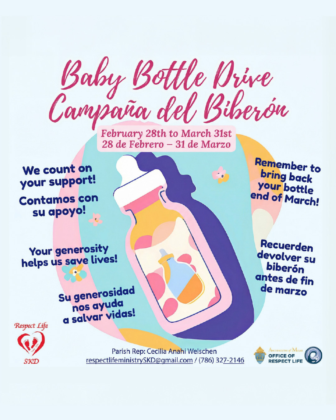 February 28th to March 31st Del 28 de febrero al 31 de marzoRemember to bring back your bottle end of March! Recuerden devolver su biberón antes de fin de marzo! Parish Rep: Cecilia Anahi Welschen (786) 327-2146 [email protected]