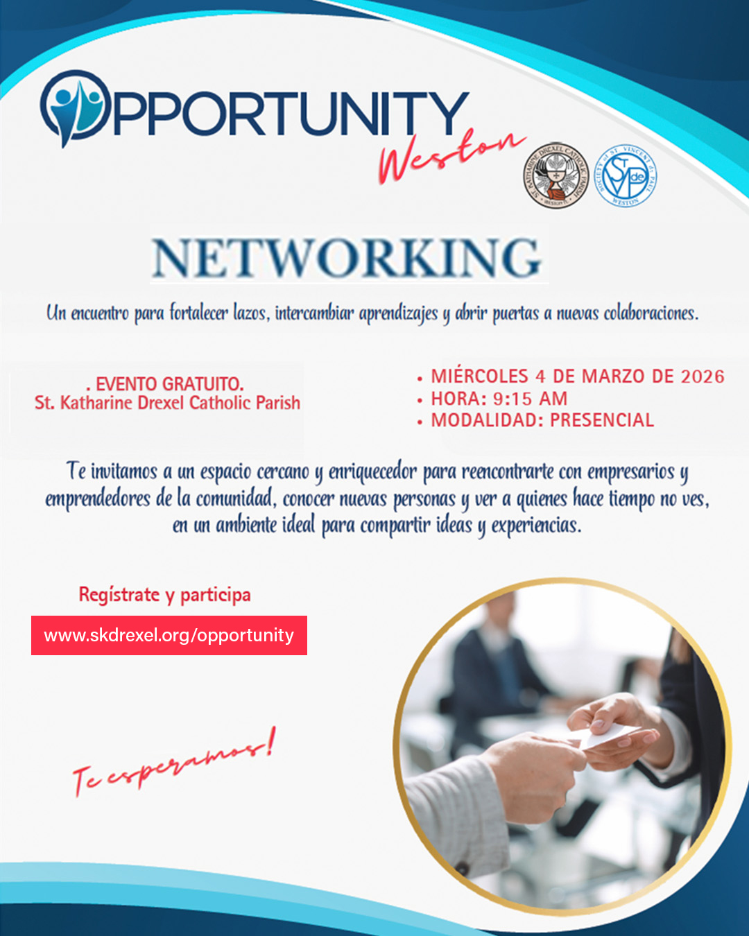 Miércoles, 4 de marzo de 2026 - 9:15am Parroquia Católica Santa Katharine Drexel Evento gratuito. ¡Regístrate y participa! www.skdrexel.org/opportunity