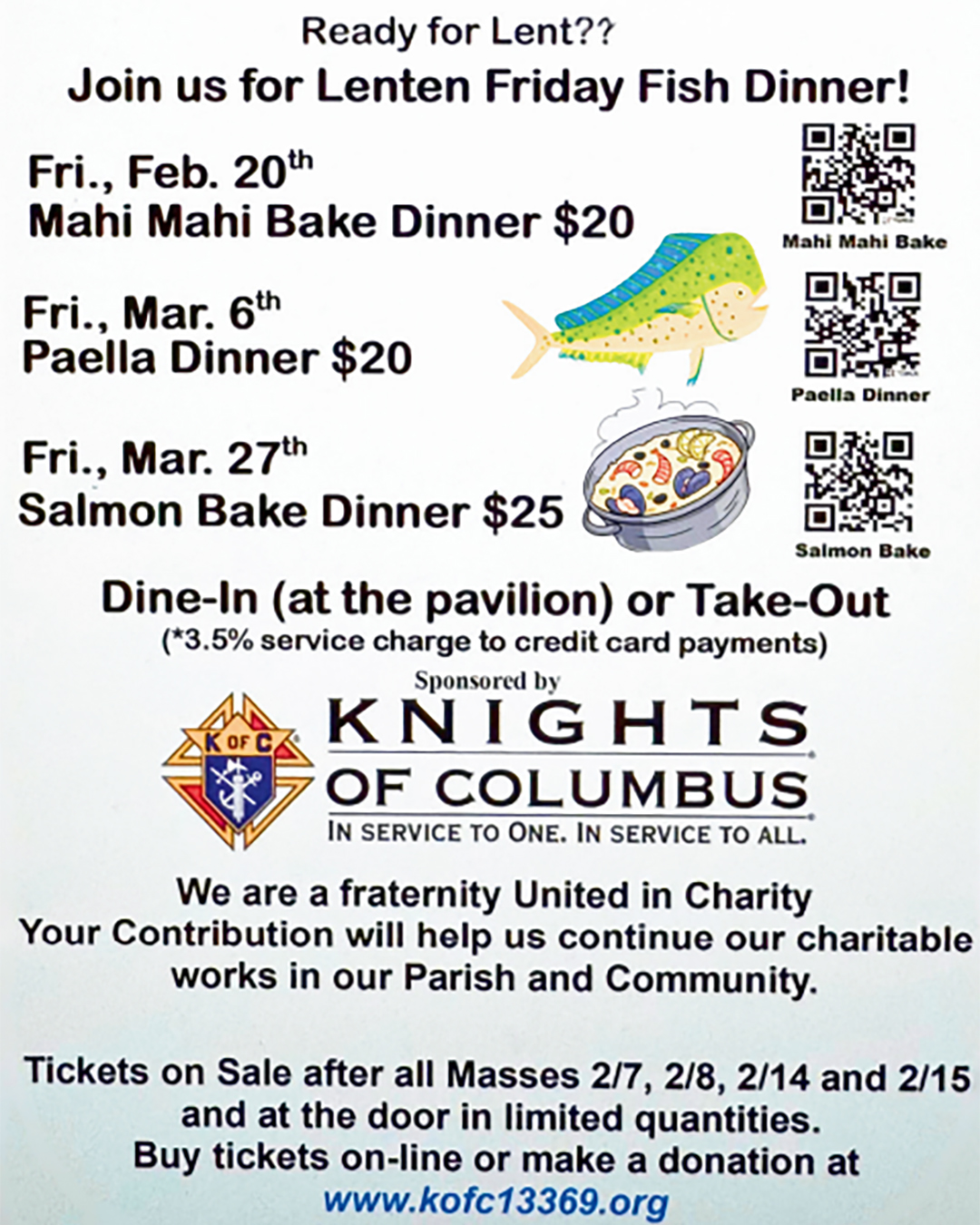 Knights of Columbus Friday Fish Dinner Join us for Lenten Friday Fish Dinner!Tickets on Sale after all Masses February 7th, 8th, 14th and 15th and at the door in limited quantities. Buy tickets on-line or make a donation at www.kofc13369.org