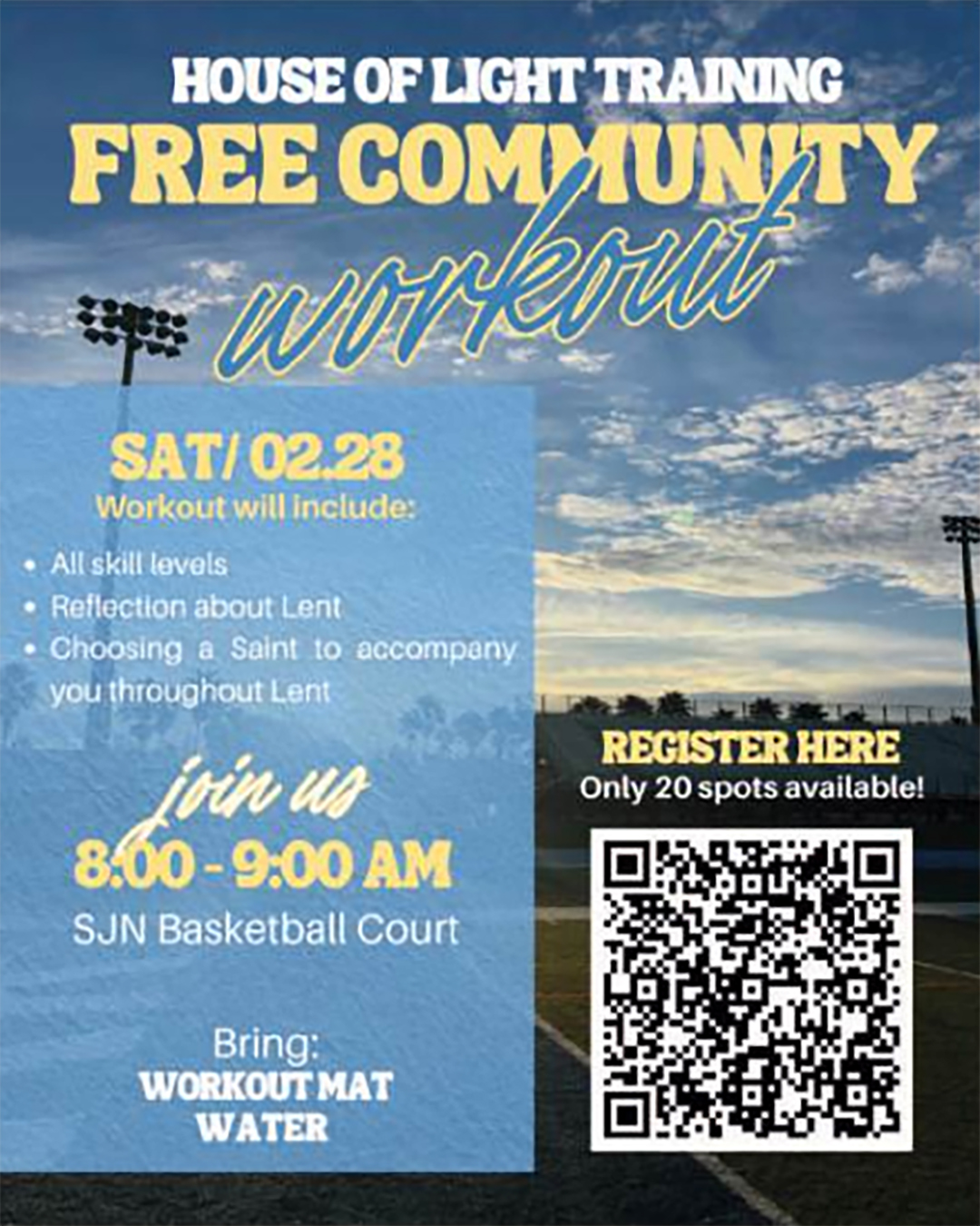 Join us at 8:00 am - 9:00 am on the SJN Basketball Court