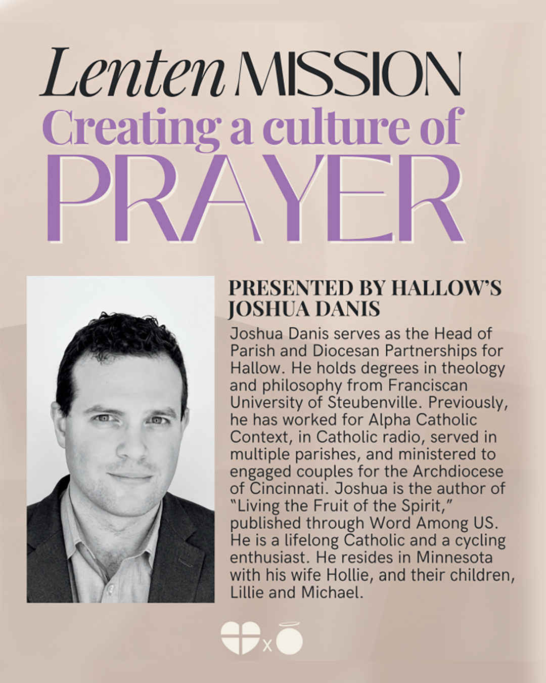 Presented By Hallow's Joshua Danis Joshua Danis serves as the Head of Parish and Diocesan Partnerships for Hallow. He holds degrees in theology and philosophy from Franciscan University of Steubenville. Previously, he has worked for Alpha Catholic Context, in Catholic radio, served in multiple parishes, and ministered to engaged couples for the Archdiocese of Cincinnati. Joshua is the author of "Living the Fruit of the Spirit,"published through Word Among US. He is a lifelong Catholic and a cycling enthusiast. He resides in Minnesota with his wife Hollie, and their children, Lillie and Michael. Misión Cuaresmal: Creando una cultura de OraciónPresentado por Joshua Danis de Hallow Joshua Danis es el Director de Asociaciones Parroquiales y Diocesanas de Hallow. Es licenciado en teología y filosofía por la Universidad Franciscana de Steubenville. Anteriórmente, trabajó para Alpha Catholic Context, en la radio católica, sirvió en varias parroquias y atendió a parejas comprometidas en la Arquidiócesis de Cincinnati. Joshua es el autor de "Viviendo el Fruto del Espíritu", publicado a través de Word Among US.Es católico de toda la vida y un apasionado del ciclismo. Reside en Minnesota con su esposa Hollie y sus hijos, Lillie y Michael. |