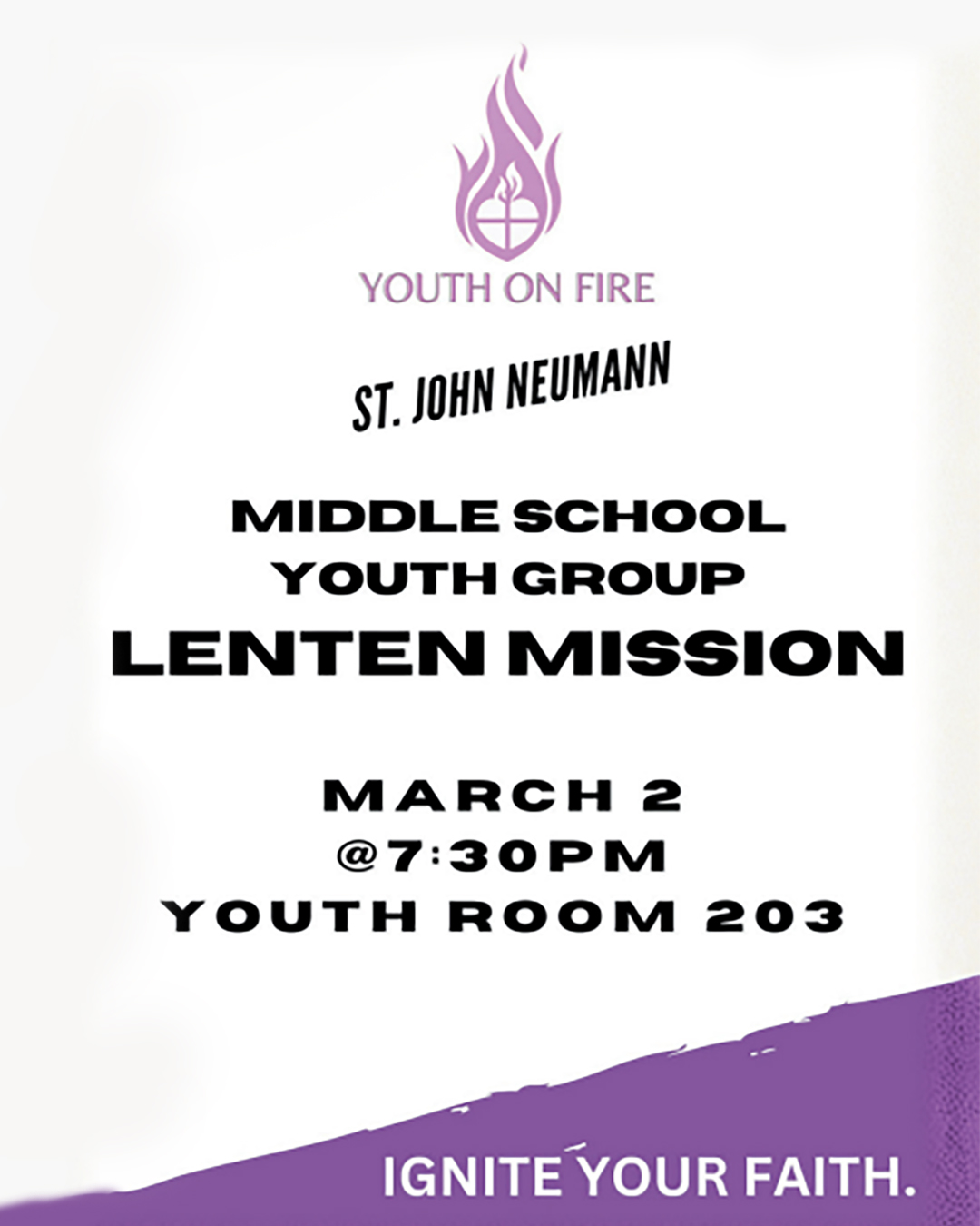 Middle School Youth Group Lenten Mission March 2nd | 7:30 pm - Youth Room 203Ignite Your Faith. |