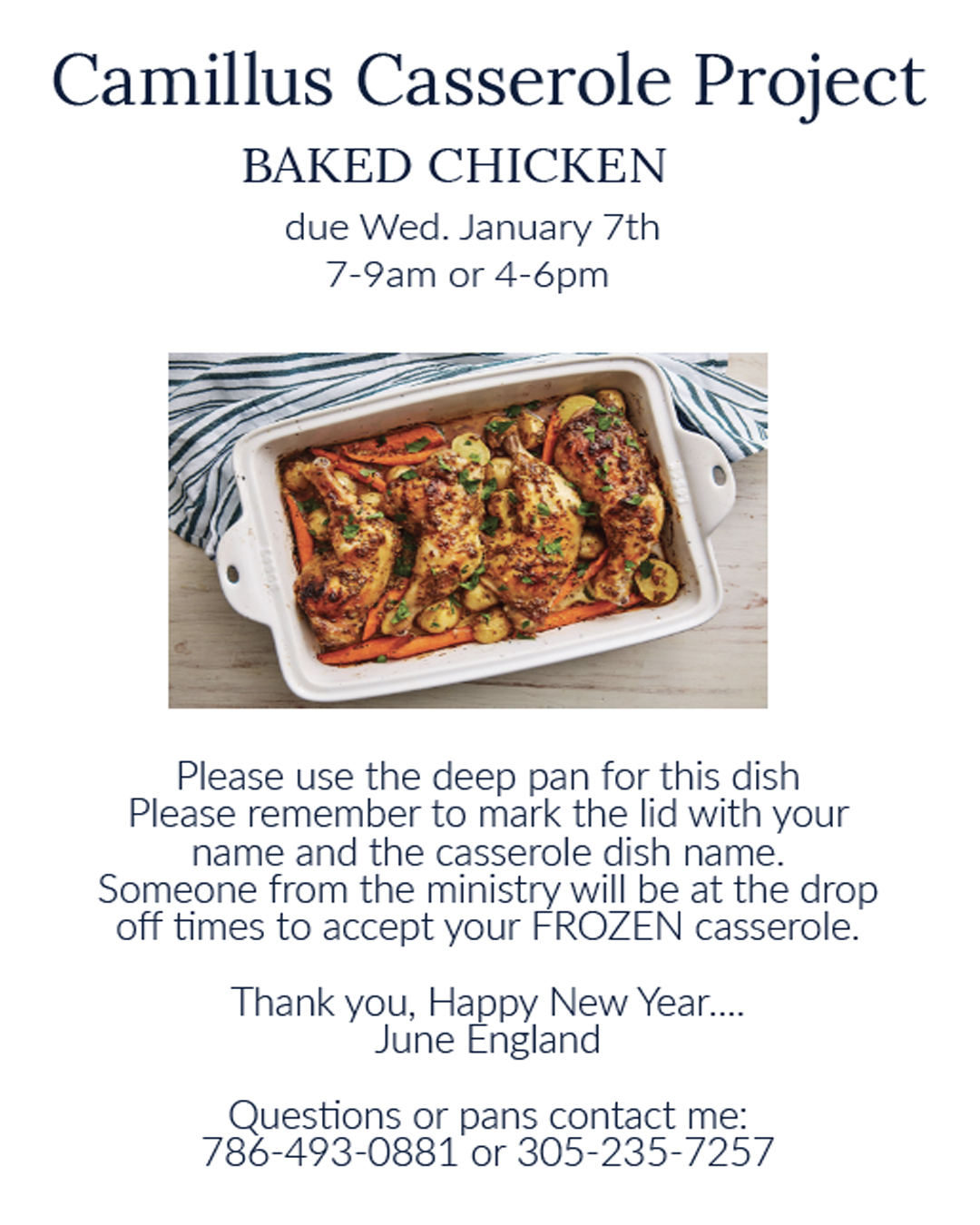St. Louis is participating in the Camillus Casserole Project by providing baked chicken casseroles for those in need. Casseroles must be prepared in a deep pan, clearly labeled, and frozen before drop-off.