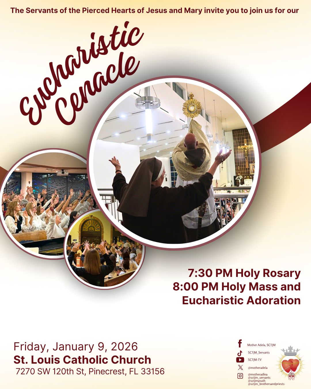 Join the Servants of the Pierced Hearts of Jesus and Mary for an evening of prayer, worship, and encounter at our Eucharistic Cenacle. Come rest in the presence of Jesus through the Holy Rosary, Holy Mass, and Eucharistic Adoration.