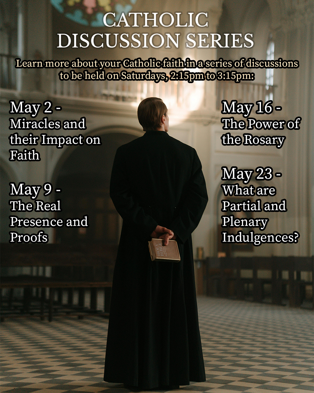 Learn more about your Catholic faith in a series of discussions to be held on Saturdays, 2:15pm to 3:15pm: