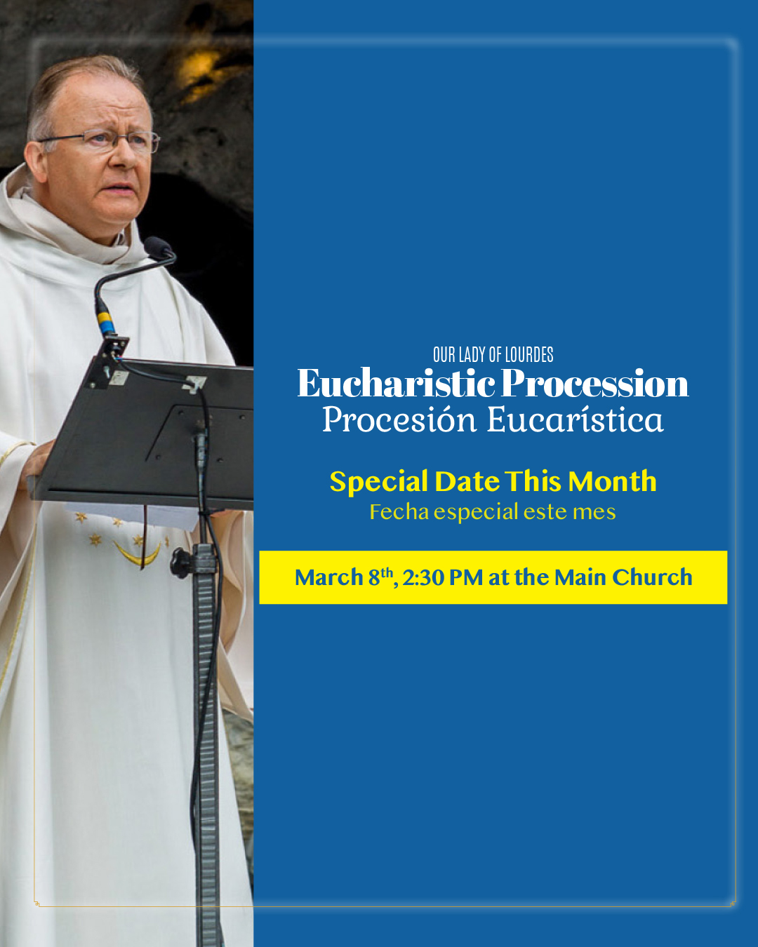 March 8th, 2:30 PM at the Main Church In joyful welcome of Fr. Michel Daubanes, Rector of the Sanctuary of Lourdes, who will be visiting our parish community in Miami, we invite everyone to join us for a special Eucharistic Procession on Sunday, March 8th. This procession will take the place of our usual monthly procession on the 11th. Please join us for our Eucharistic Procession and Benediction of the Sick. Everyone is invited, especially those who are sick and their caretakers. Invite everybody! We are waiting for you! -